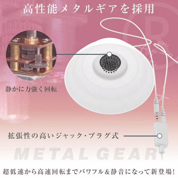 「金属ギア」搭載!静かに、ゆっくり、力強い回転が止まらない!大幅機能アップでもお値段そのまま!美しい流曲線のカップは乳房のサイズやかたちに関係なくやさしく吸着。